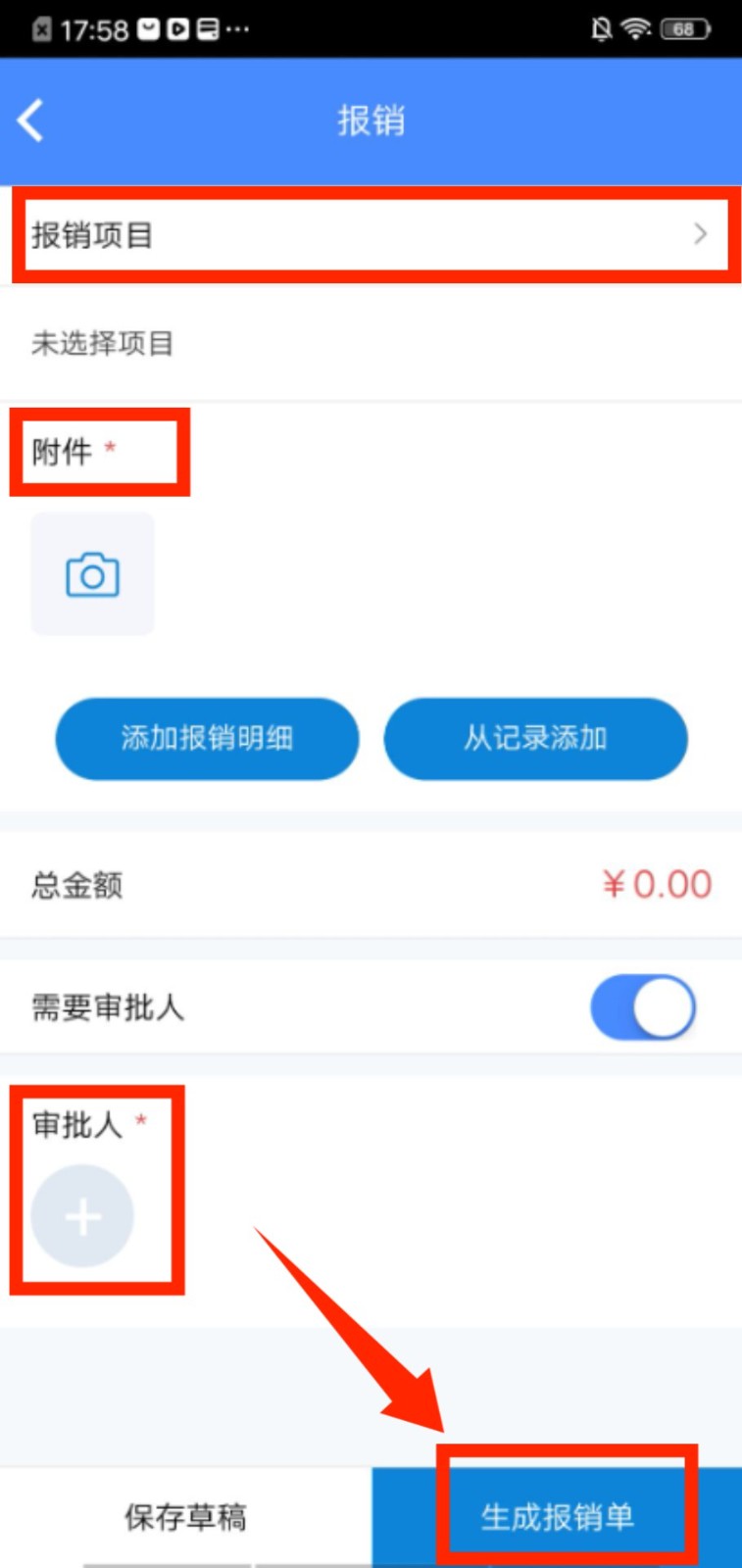 2、在报销页面,先选择对应的报销项目,再通过附件区域添加相关凭证材料,完善基础信息。