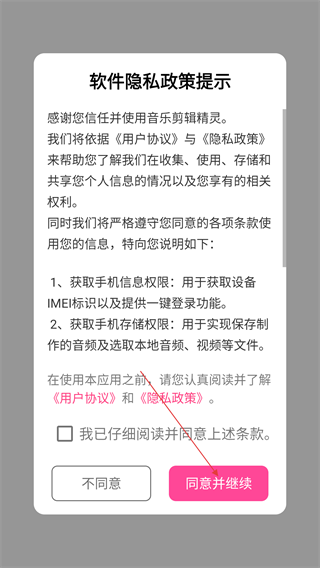 1、首次打开【音乐剪辑精灵】,阅读《软件隐私政策提示》后,勾选“我已仔细阅读并同意上述条款”,点击【同意并继续】进入应用。