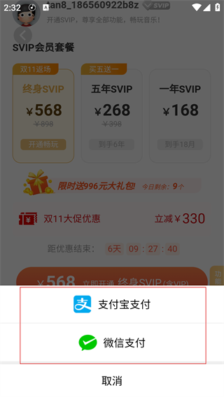 4、在弹出的支付方式选择框中选择支付宝支付或微信支付,完成支付即可开通SVIP会员,尊享全部音乐功能。
