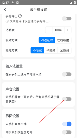 4、在云手机设置页,找到“声音设置”模块,开启“云手机静音”的开关,即可使所有云手机设备处于静音状态,避免音频干扰。