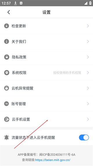 3、在设置页,选择【云手机设置】选项,进入云手机功能配置页面。