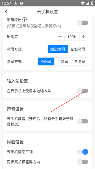 4、在云手机设置页,找到“输入法设置”模块,开启“在云手机上使用本地输入法”的开关,即可在云手机中调用本地设备的输入法。