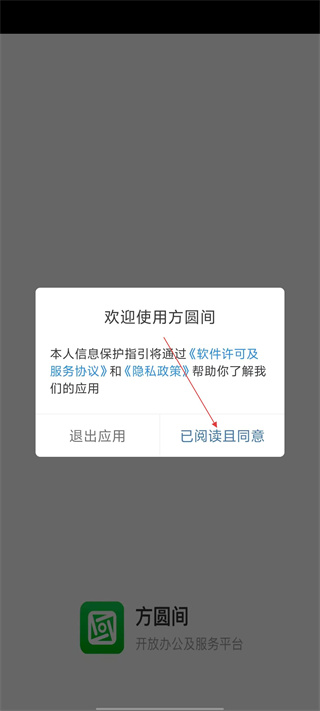 1、打开【方圆间】应用后,阅读【软件许可及服务协议】和【隐私政策】,点击【已阅读且同意】进入应用。
