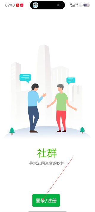 2、进入应用后,在【社群】页面可寻求志同道合的伙伴,点击下方【登录/注册】按钮进入登录界面。