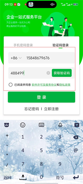 4、在【验证码登录】界面,输入手机号码并获取验证码,填入后勾选协议,点击【登录】完成账号登录。