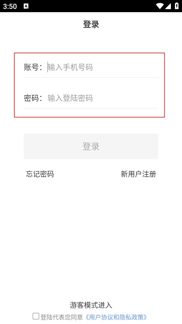 4、在登录页面输入手机号码和登录密码,勾选同意《用户协议和隐私政策》后,点击【登录】按钮完成登录操作。