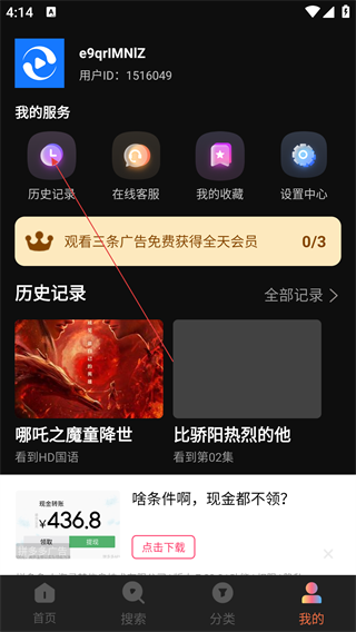 2、进入【我的】页面后,点击【历史记录】选项,可查看之前观看过的影视内容记录。
