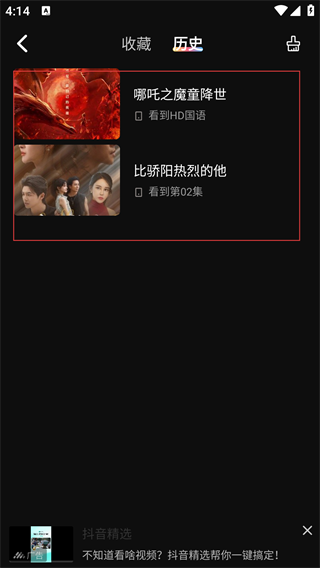 3、在历史记录页面,可看到过往观看的影视条目,点击对应的条目可继续观看之前未看完的内容。