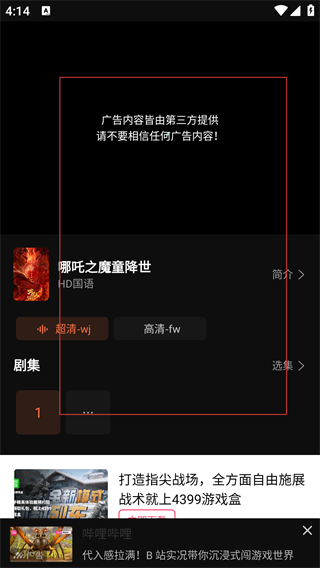 4、继续观看影视时,可在播放页面调整【超清-wj】【高清-fw】画质,还可切换选集,提升观影体验。