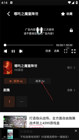 4、切换画质后,可在播放页面调整播放倍速、选集,也可点击右上角收藏按钮将影片加入收藏夹,方便后续观看。