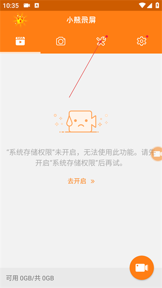1、在【小熊录屏】页面,若提示【系统存储权限】未开启,点击【去开启】按钮授权,即可正常使用功能。