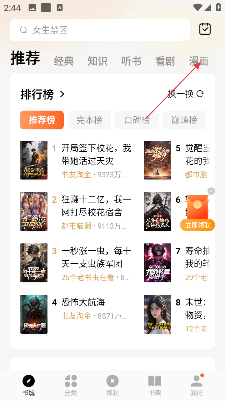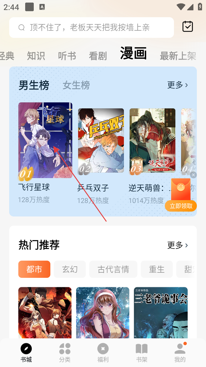 2、进入【漫画】分类后,能看到男生榜、女生榜等榜单,可从中挑选感兴趣的漫画。