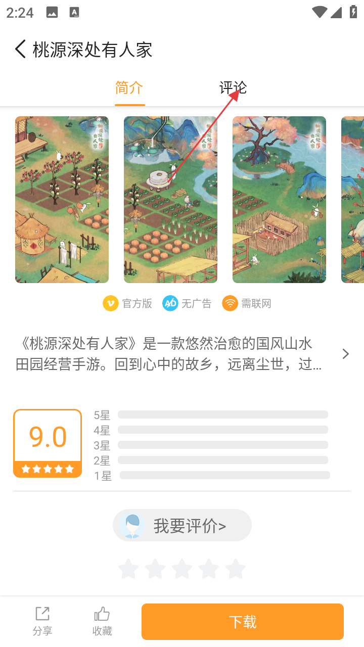 3、在游戏详情页面,点击【评论】选项,可查看用户评价板块。