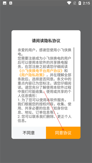 1、使用【小飞侠换电】前,需阅读【用户隐私政策】,了解信息收集规则后选择【同意协议】进入。
