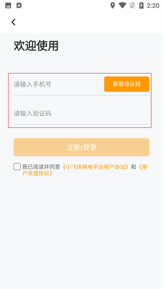 4、完成【小飞侠换电】登录/注册时,需输入【手机号】并获取【验证码】,勾选协议后提交。