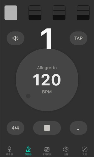 2、进入节拍器页面,设置所需的节拍速度和拍号。
