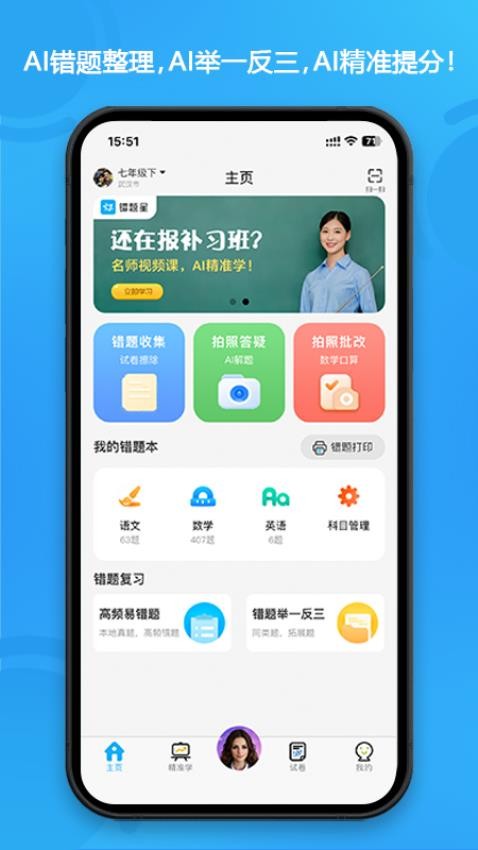 1、打开错题星App主页,利用【错题收集】【拍照答疑】【作业批改】功能辅助学习,通过【语文】【数学】【英语】科目管理各科错题。