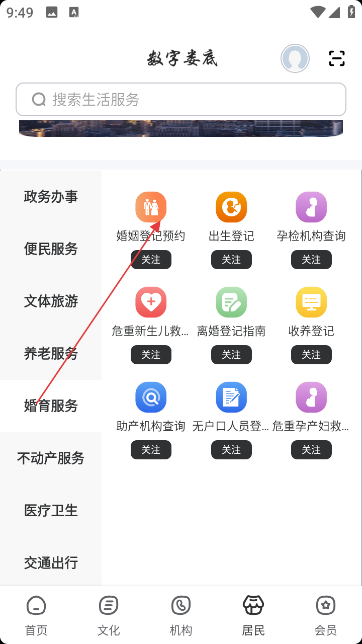 2、在居民服务页,左侧栏找到【婚育服务】,点击进入对应板块。