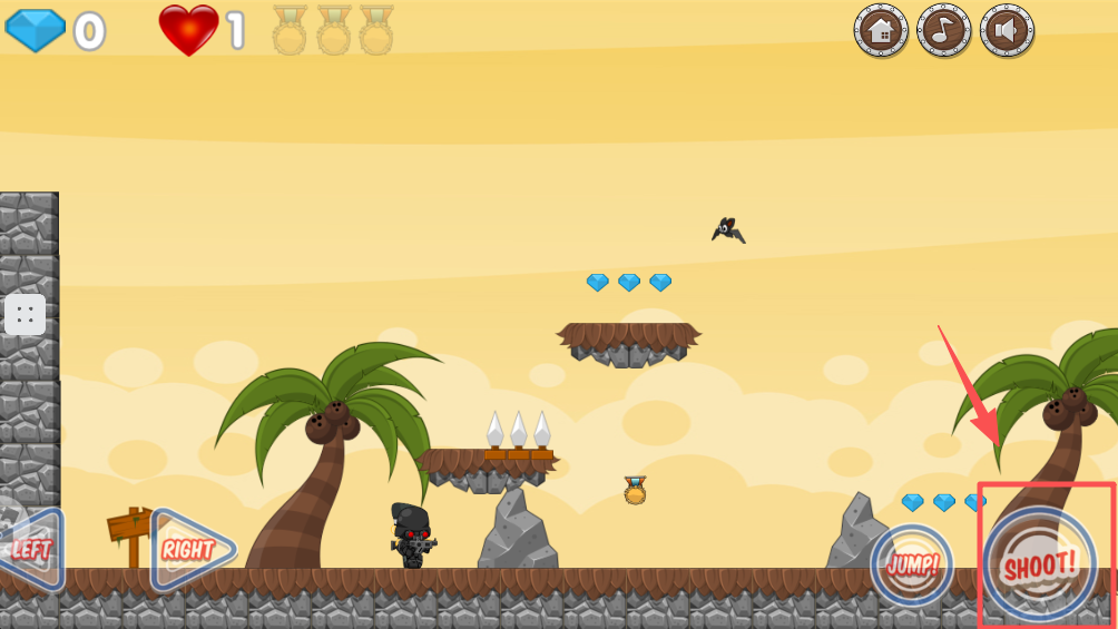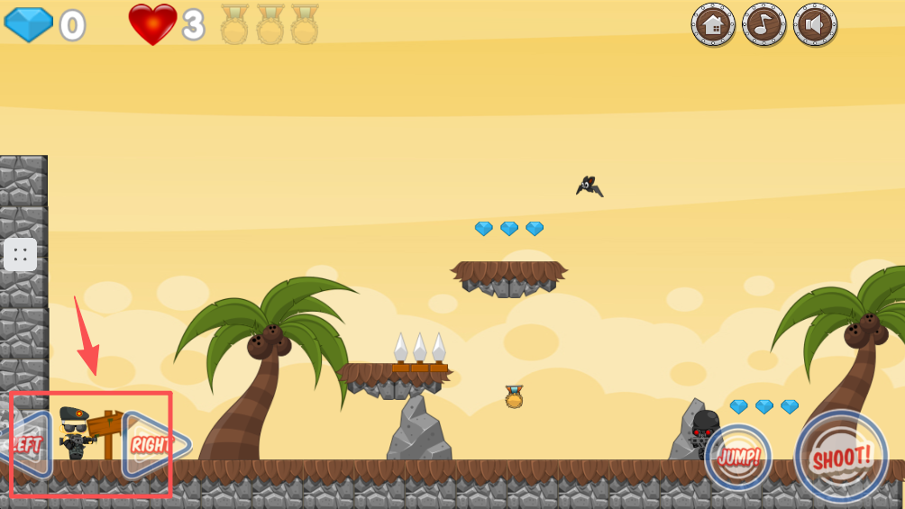 1、操控角色移动:通过虚拟按键或手势控制士兵奔跑、跳跃,避开地面尖刺与移动平台上的机关。