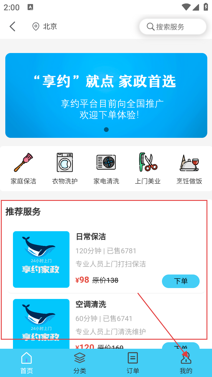 1、打开“享约”APP,可在首页浏览推拿按摩、家政服务等项目,选择任意一个项目。