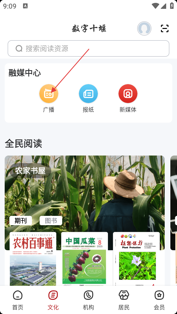 2、在文化页面的融媒中心区域,点击【广播】,进入广播频道列表页面。