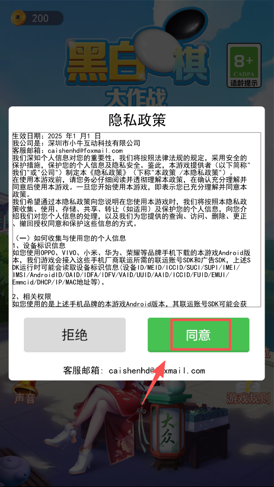 1、阅读并同意隐私政策,点击“同意”按钮,开始游戏之旅。