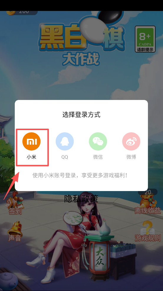 3、选择登录方式,这里以“小米”账号为例,点击图标进行登录。