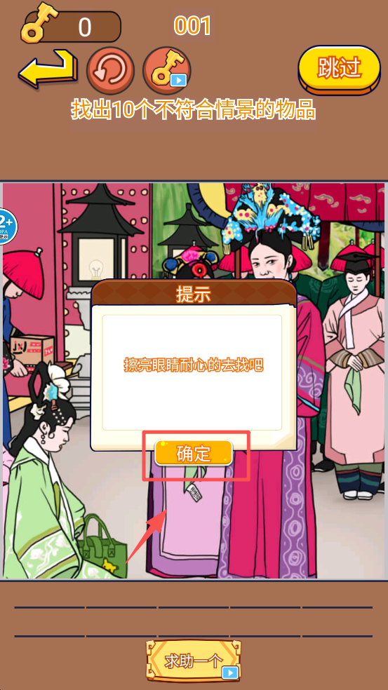 3、阅读提示信息,点击“确定”开始寻找不符合情景的物品。
