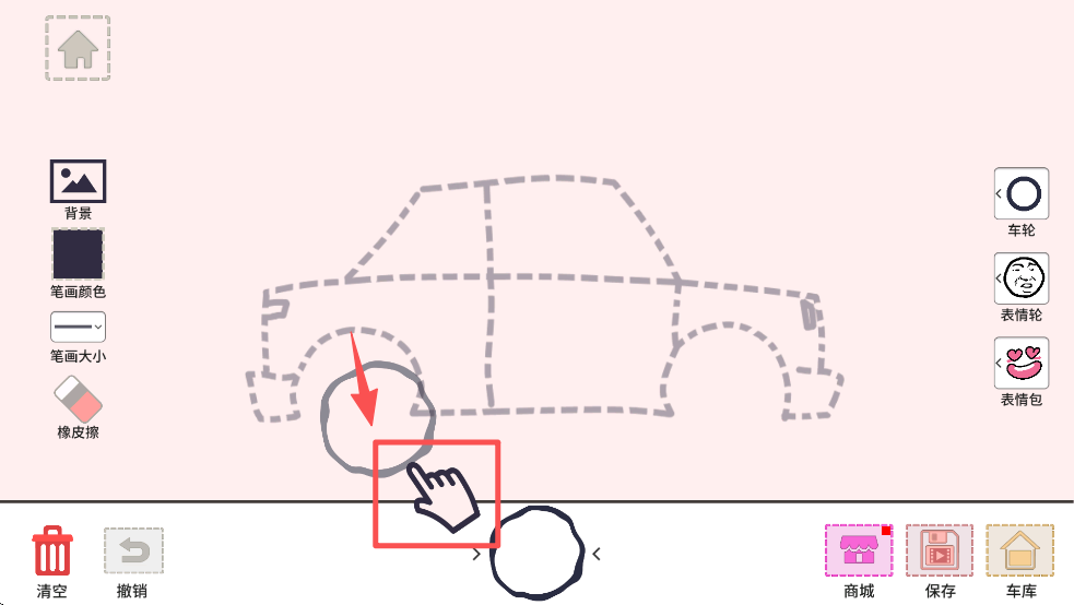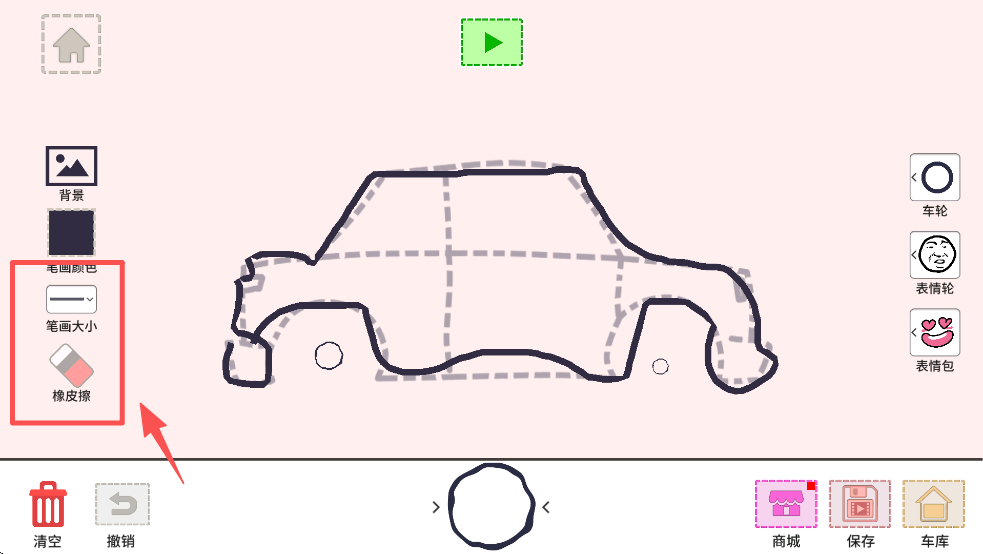 2、在画布上按照虚线轮廓绘制车辆,使用左侧工具栏中的功能来调整笔画颜色和大小。