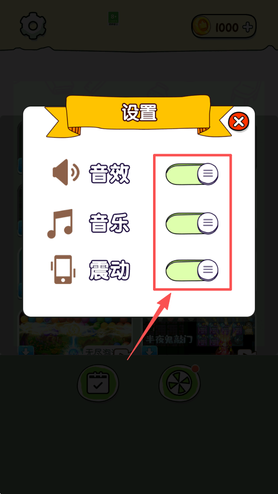 3、点击设置按钮,调整音效、音乐和震动选项,以适应你的偏好。