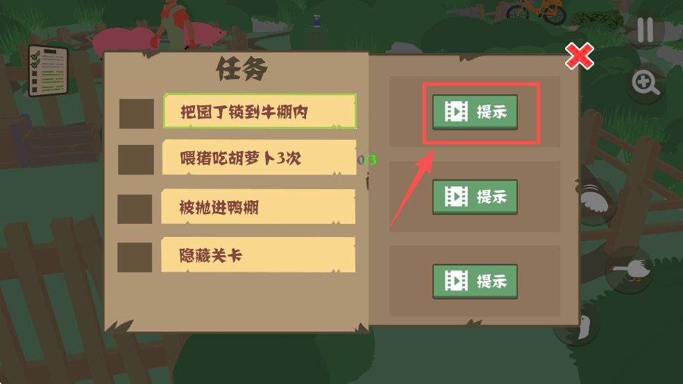 4、点击任务列表中的“提示”按钮,查看当前任务和目标,帮助你完成关卡。
