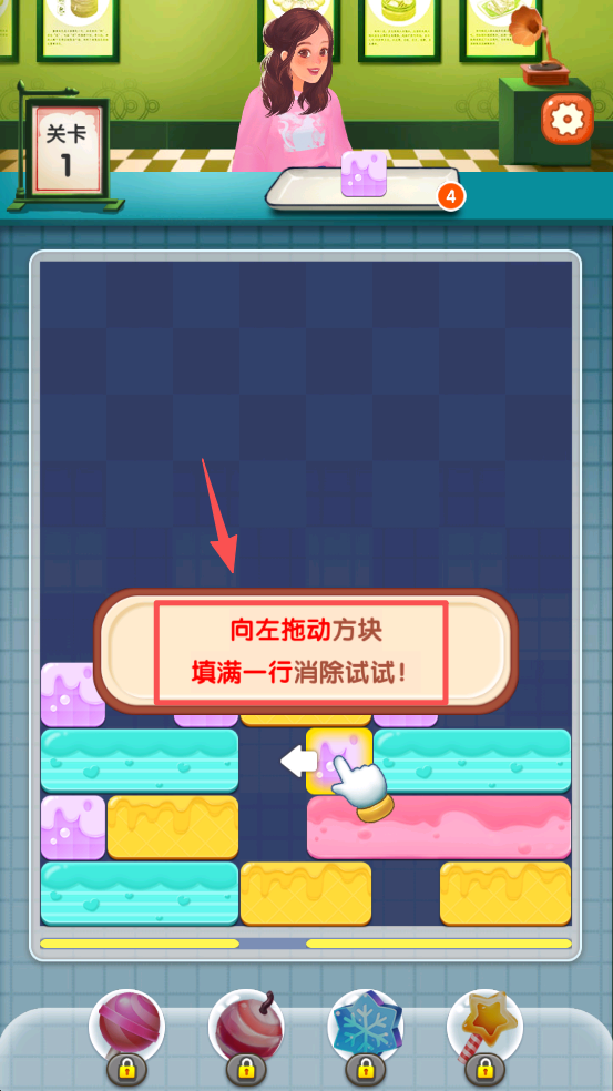 1、向左拖动方块,填满一行以消除方块,这是游戏的基本操作。