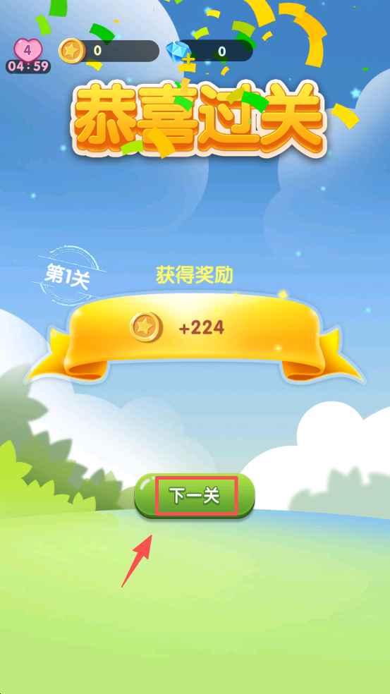 3、庆祝过关!点击“下一关”按钮,继续你的游戏旅程。