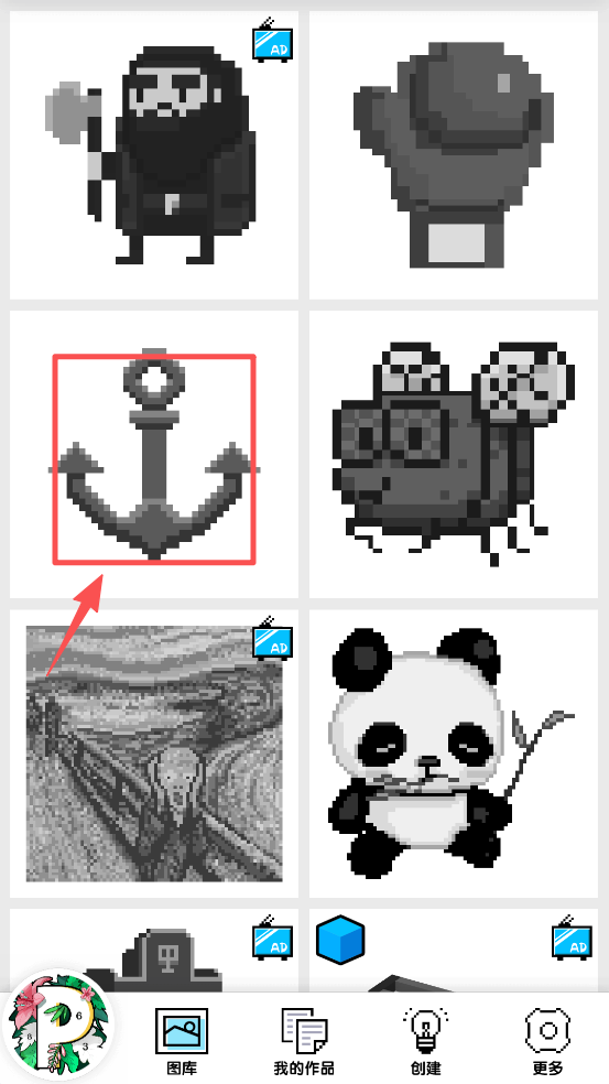1、从图库中选择一个像素画,或者点击“创建”开始新的绘画。