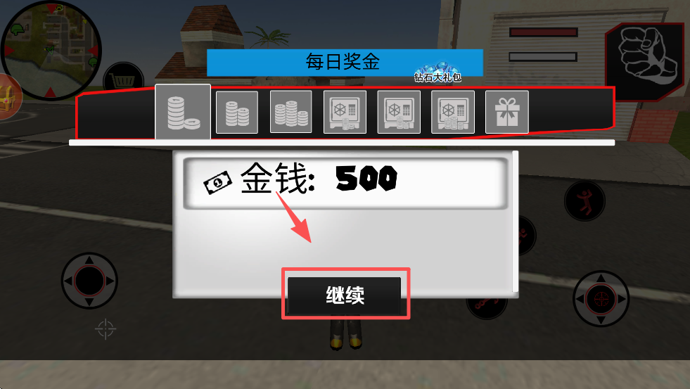 2、点击“继续”按钮领取每日奖励,这是获取游戏内货币的简单方式。