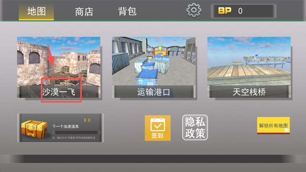1、点击“沙漠一飞”地图,选择游戏关卡,这是进入游戏的第一步。