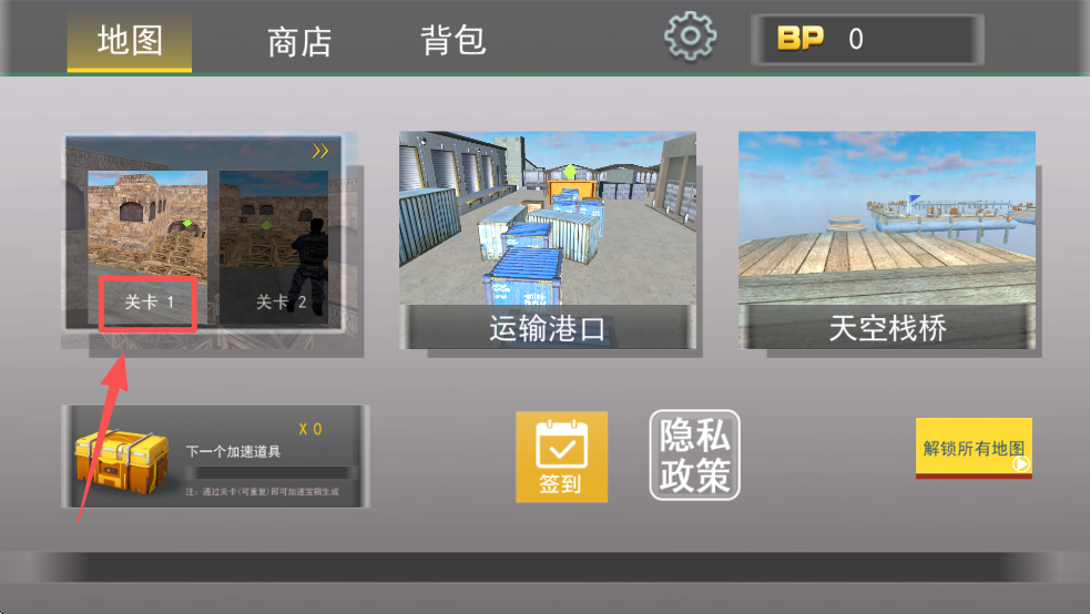 2、点击“关卡1”开始游戏,准备开始你的冒险之旅。