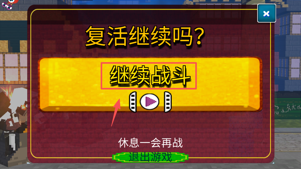4、当角色生命值耗尽时,点击“继续战斗”按钮复活并继续游戏。
