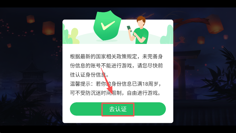 1、点击“去认证”按钮,根据提示完成实名认证,以便正常进行游戏。