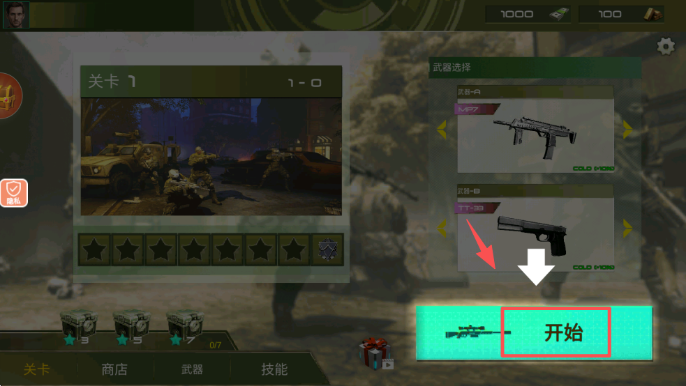 1、选择关卡1开始游戏,点击“开始”按钮进入战斗场景。
