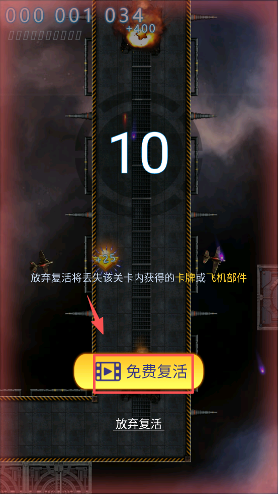4、如果战机被击落,可以选择“免费复活”继续游戏。