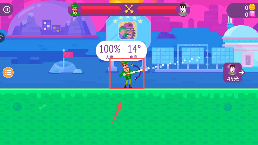 1、准备射击,在游戏界面中,调整力度和角度,准备发射弹弓。