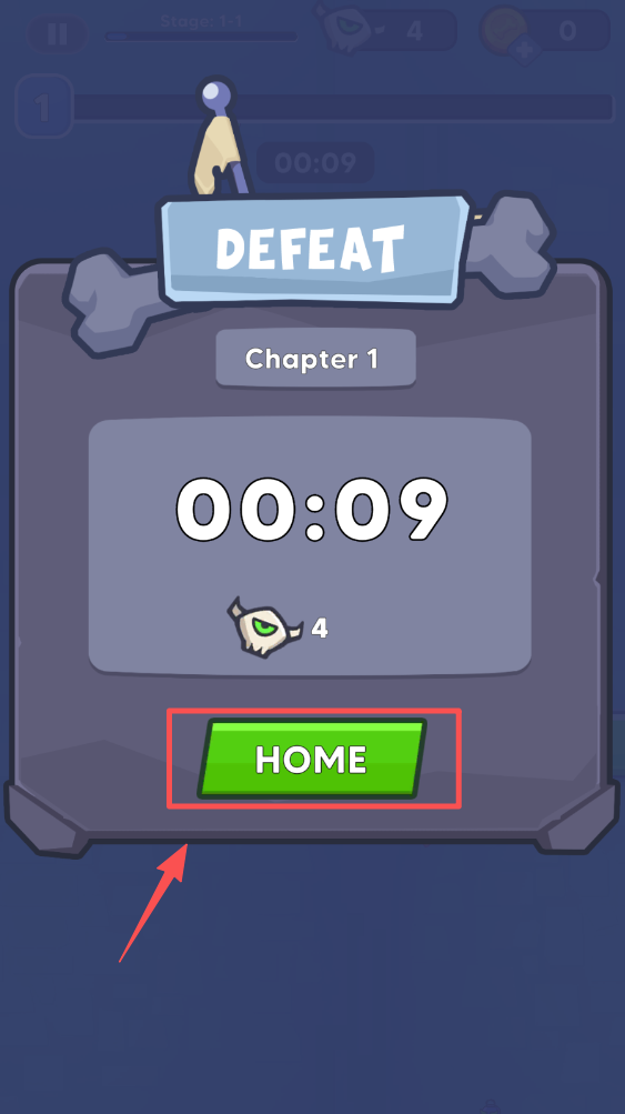 4、结束游戏,战斗结束后点击“HOME”按钮,返回主菜单,准备下一关。