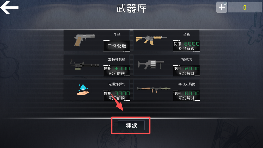 2、选择武器,在武器库中选择适合的武器,点击“继续”准备战斗。