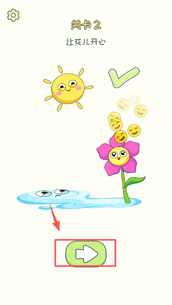 4、观察花朵开心后,点击绿色的箭头按钮,进入下一关,继续游戏挑战。