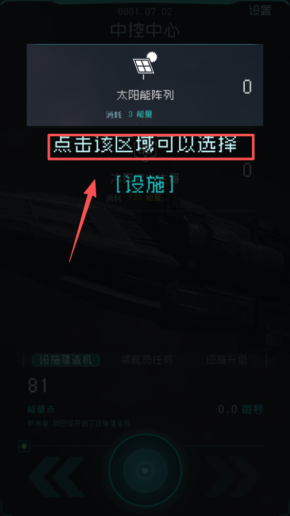 3、点击该区域可以选择设施。在这里,你可以选择不同的设施来建造,以增强你的飞船能力。