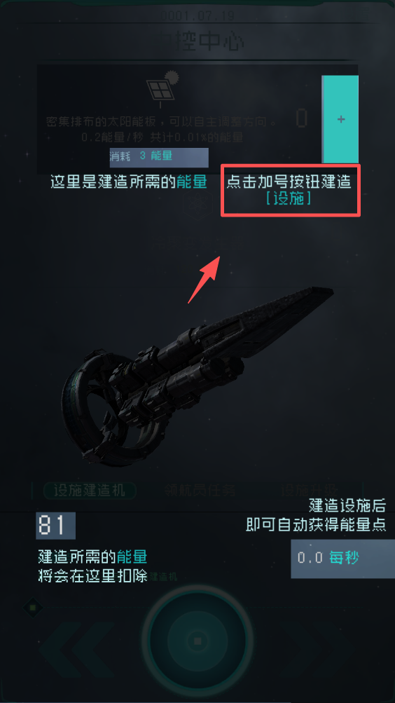 4、点击加号按钮建造设施。确认选择后,点击建造按钮开始设施的建造过程,自动获取能量点。