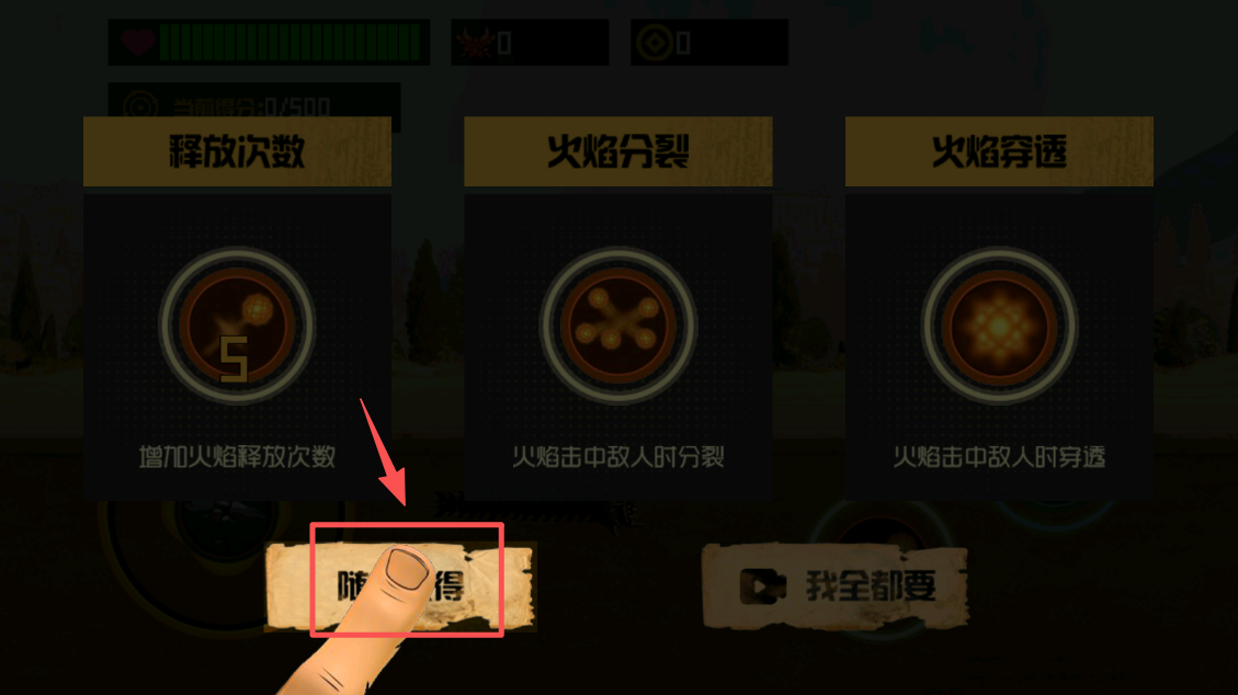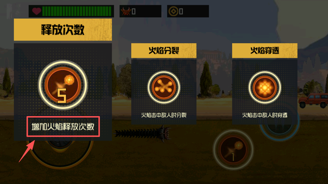 3、点击“增加火焰释放次数”按钮,增强角色能力,准备战斗。