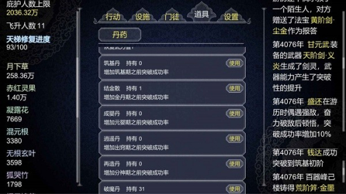 4、点击“道具”按钮,使用丹药等道具,增强弟子的能力或突破成功率。