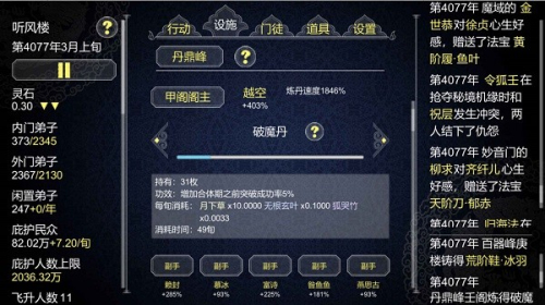 1、点击左上角的播放按钮,可以快进时间,加速宗门的发展进程。